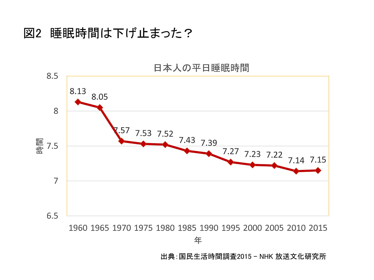 70年代以降、日本人はどんどん短眠になっていきました。国民全体の1日の睡眠時間(平均時間)は,平日7時間15分(図2)、土曜7時間42分,日曜8時間3分で、特に平日の睡眠時間が減っています*2。