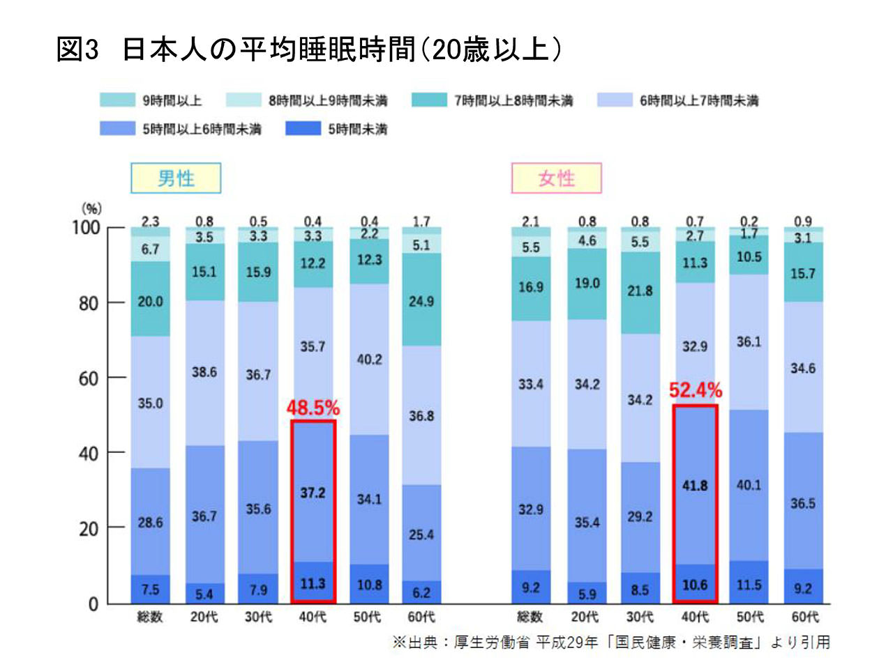 怖いのは、「睡眠負債を抱えている」という自覚がしばしば欠けること。睡眠が足りていないにもかかわらず、それに気づいていない人が少なからずいるということが推測されます。本来成人には1日6時間半~7時間半の睡眠時間が必要です。しかし厚生労働省の調査によると、睡眠時間が6時間未満の人は約4割、40代については約半数にものぼります(図3)*3。自覚症状を感じにくい睡眠負債は、決して他人ごとではないといえるでしょう。