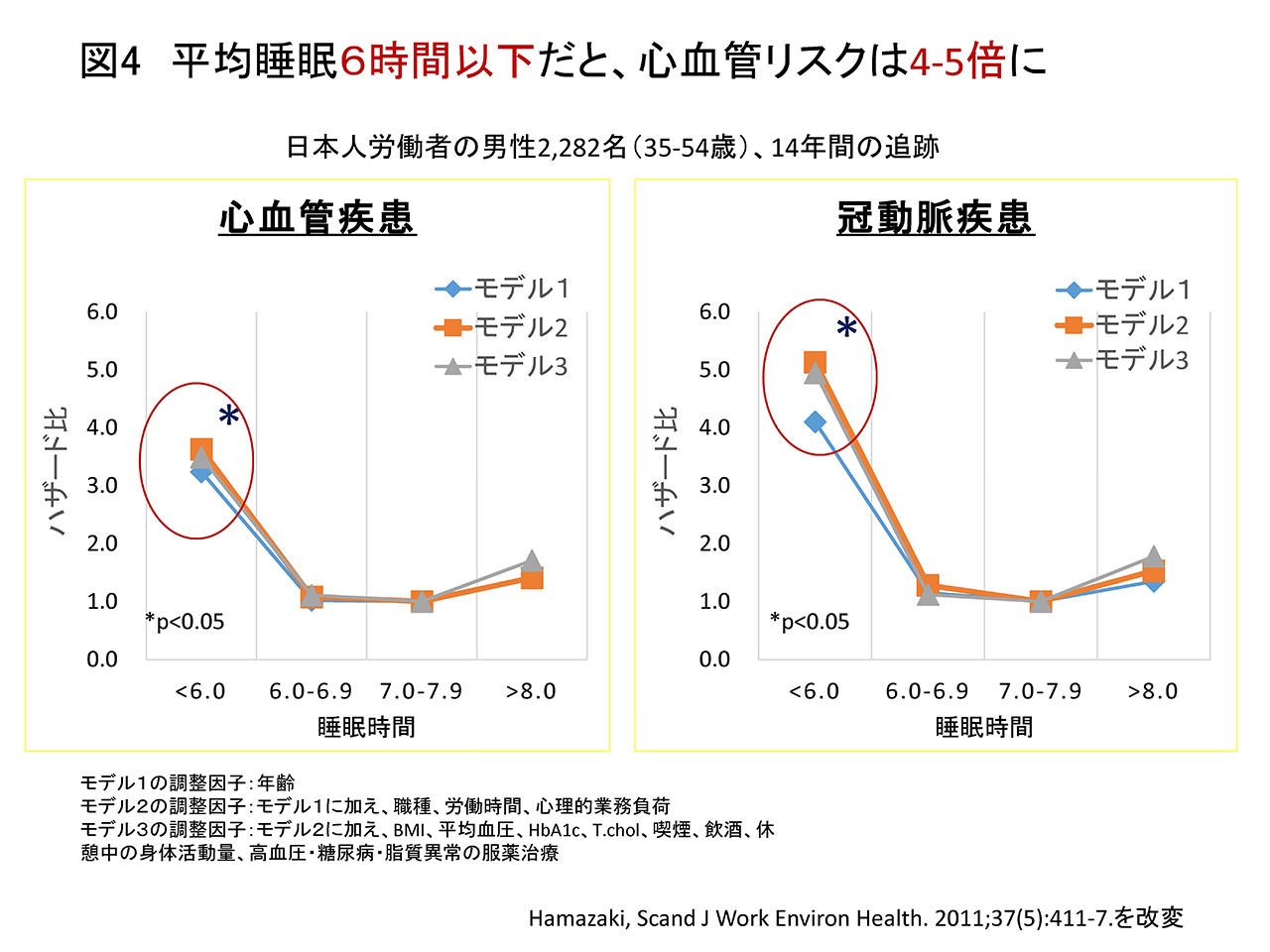 図4をみると、睡眠時間が6時間未満の場合、6~7時間の場合に比べて心血管疾患のリスクは4-5倍になることがわかります*4)。