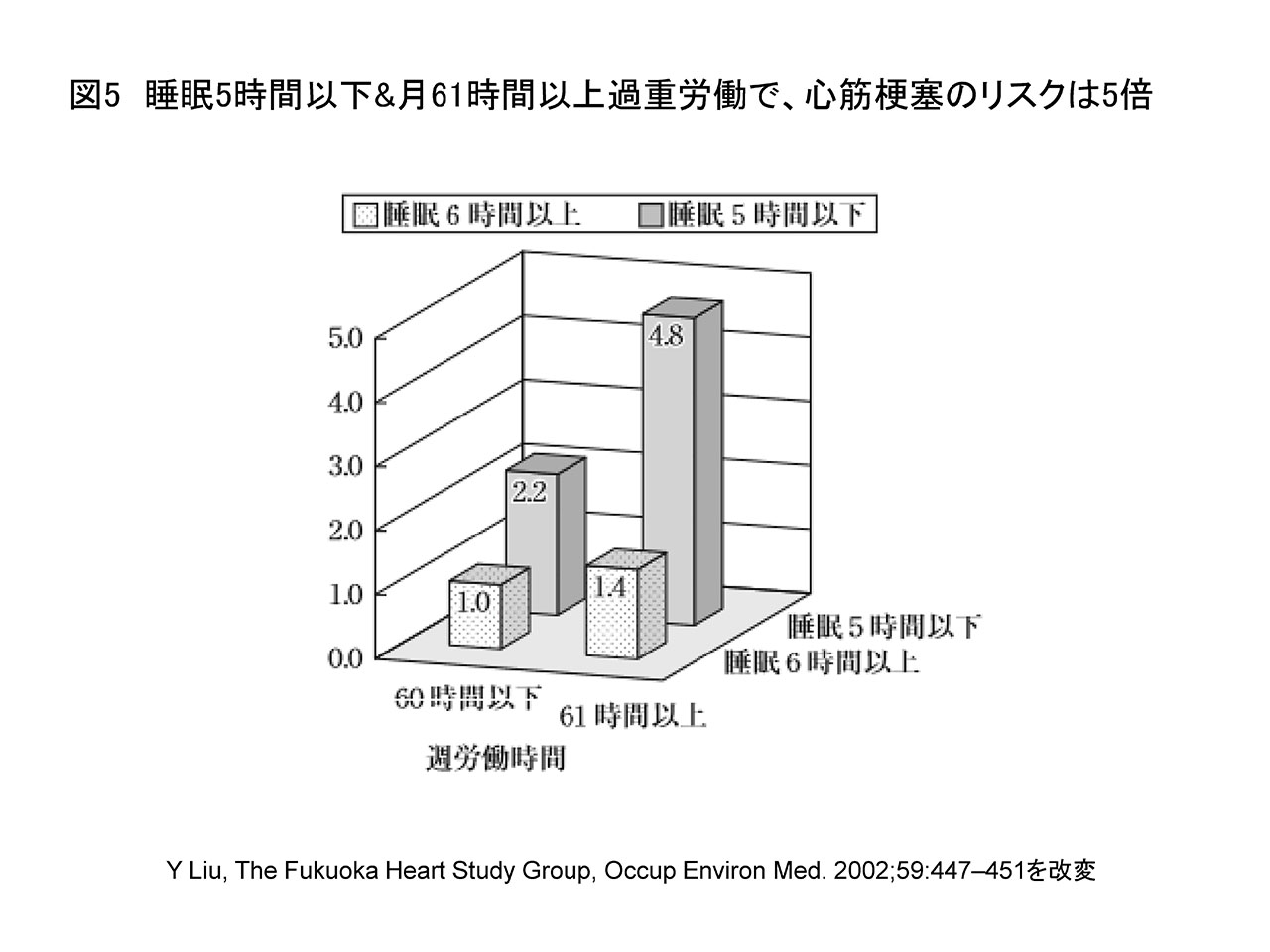 また、図5では、睡眠時間5時間以下でつき61時間以上の過重労働を続けると、心筋梗塞のリスクは約5倍に跳ね上がることがわかります*5。