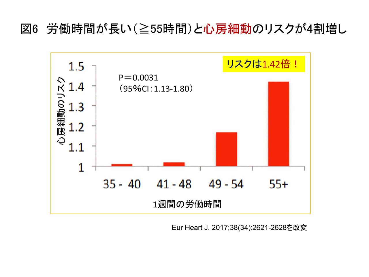 さらに、図6は「労働時間が長い(≧55時間)と心房細動のリスクが4割増す」ことを表しています。同じく週55時間以上の過重労働で高まるリスクとして、肥満(1.34倍)、不活動(1.18倍)、喫煙(1.15倍)、アルコール多飲(1.18倍)などが挙がっています*6。
