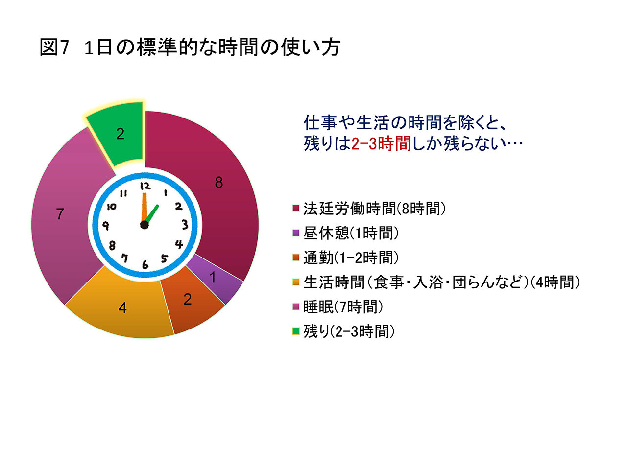 図7に1日の時間の使い方を示しました。睡眠を7時間確保すると、残りは2-3時間しかなく、2時間残業すれば、あとは睡眠時間を削るしかありません。毎日2時間は概ね月45時間程度に相当し、これが、現在の超過勤務の上限規定の根拠となっています。