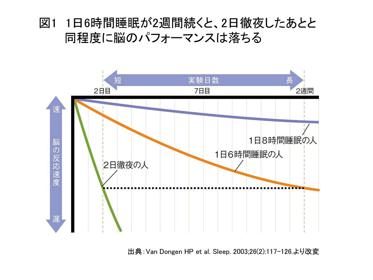 図1を見てください。6時間睡眠が2週間続くと、1晩徹夜したあと同じレベルに脳のパフォーマンスが低下することを表しています。さらに、4時間睡眠が続くと、1週間後には何と、脳のパフォーマンスは2晩徹夜明けと同じくらい低下することが示されています*1。